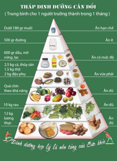 Một tháp dinh dưỡng đầy đủ gồm 7 tầng, cung cấp đủ các dưỡng chất: Chất đạm, chất béo, muối, đường, chất xơ, hoa quả và tinh bột. Độ quan trọng và khối lượng các thực phẩm sẽ được thay đổi sao cho phù hợp với các lứa tuổi.